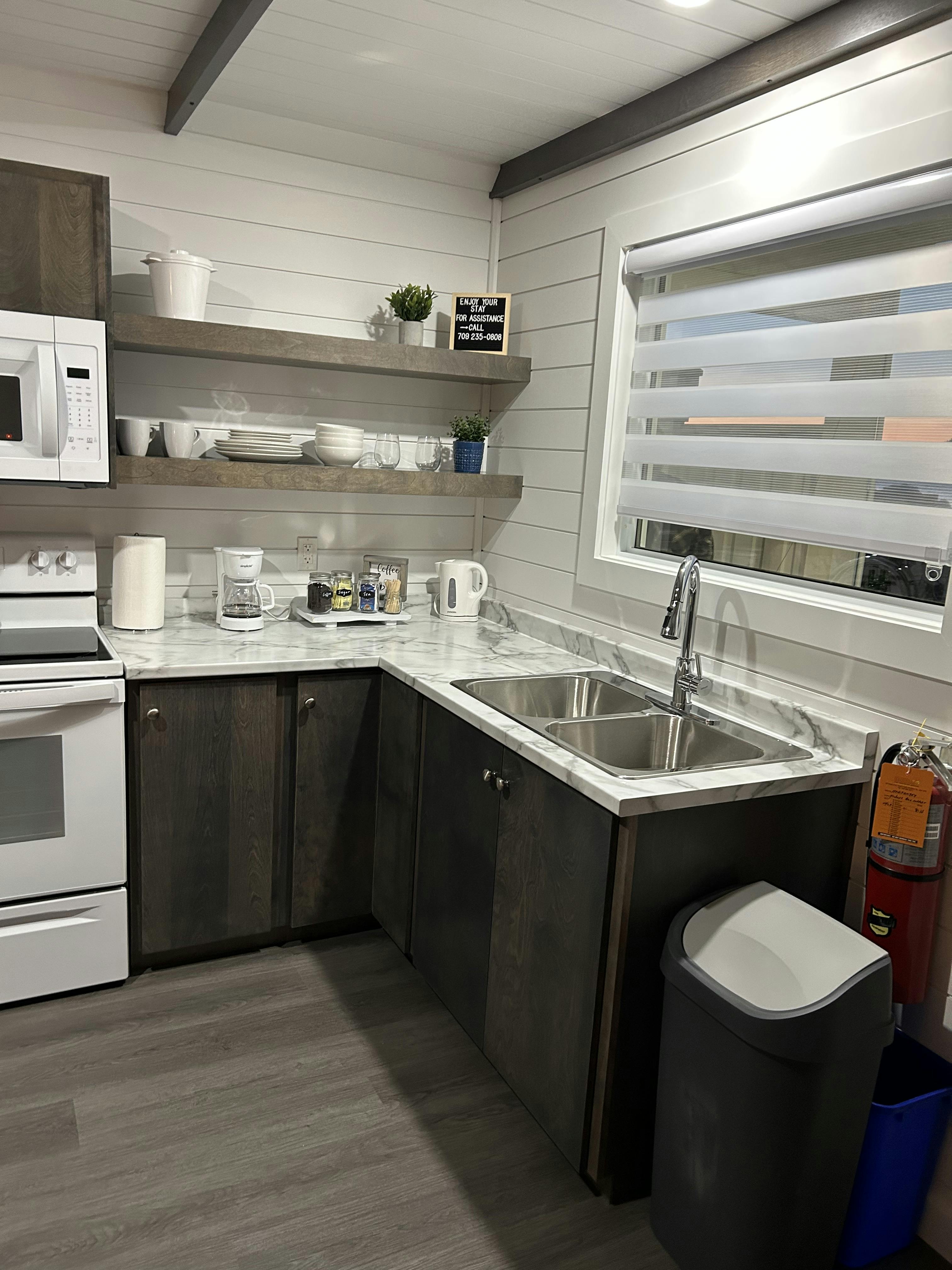1 queen bed with sofa bed. Includes full kitchen. Wi-Fi.